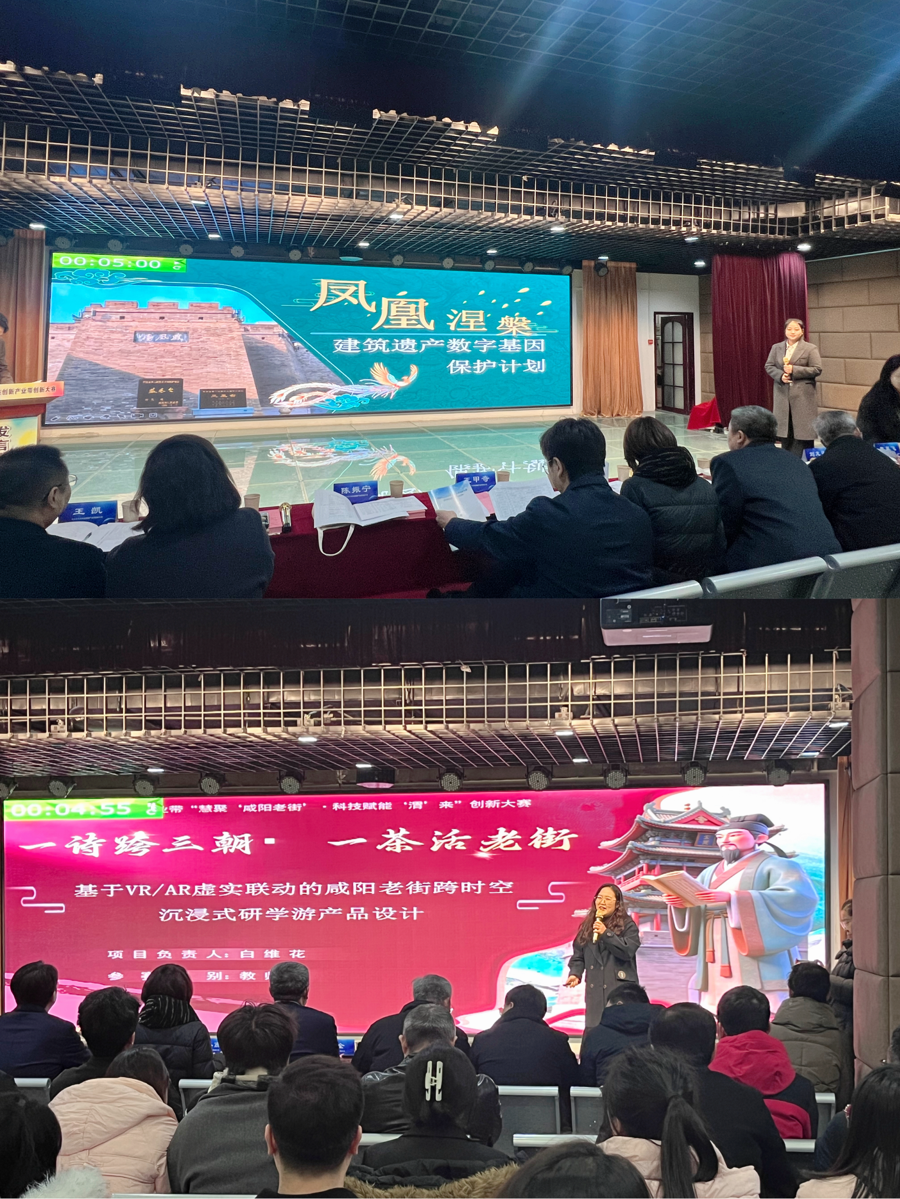本次大赛聚焦咸阳老街文化传承与创新应用,从156个项目中最终选出18个优秀项目进入决赛。我校白维花老师的参赛项目《一诗跨三朝・一茶活老街:基于VR/AR虚实联动的咸阳老街跨时空沉浸式研学游产品设计》以王维《渭城曲》诗意文化为引,以国家级非遗茯茶技艺为体验主线,串联古渡遗址、清渭楼、凤凰台等核心地标,构建起跨越唐代、明清、80年代三个时空维度的沉浸式研学数字文化长廊,成功破解了传统文旅展示同质化、研学体验碎片化等行业痛点。