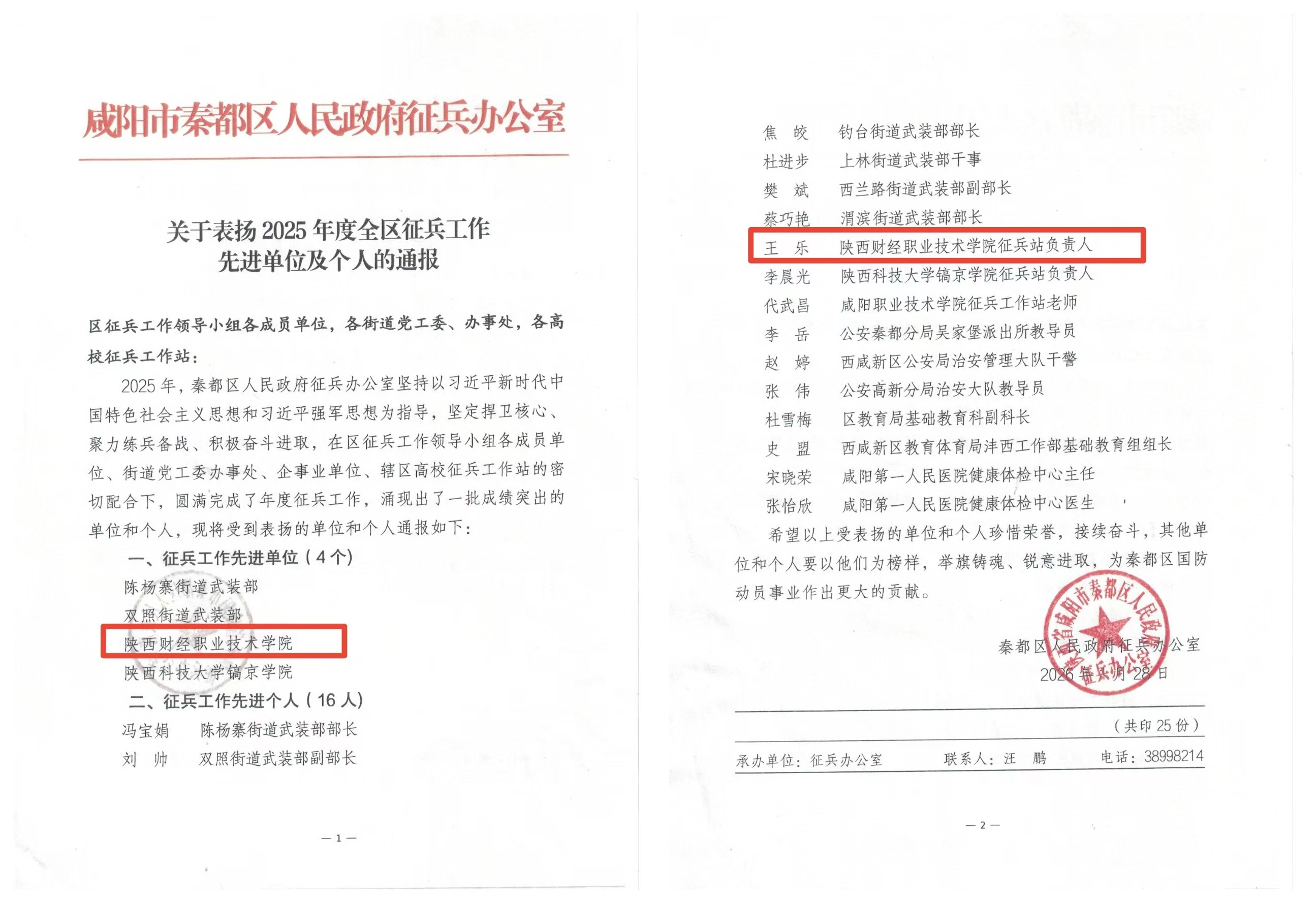 近日,咸阳市秦都区人民政府征兵办公室通报表彰了全区2025年度征兵工作先进单位及先进个人,我校被评为“2025年度征兵工作先进单位”,王乐同志获得“2025年度征兵工作先进个人”荣誉。