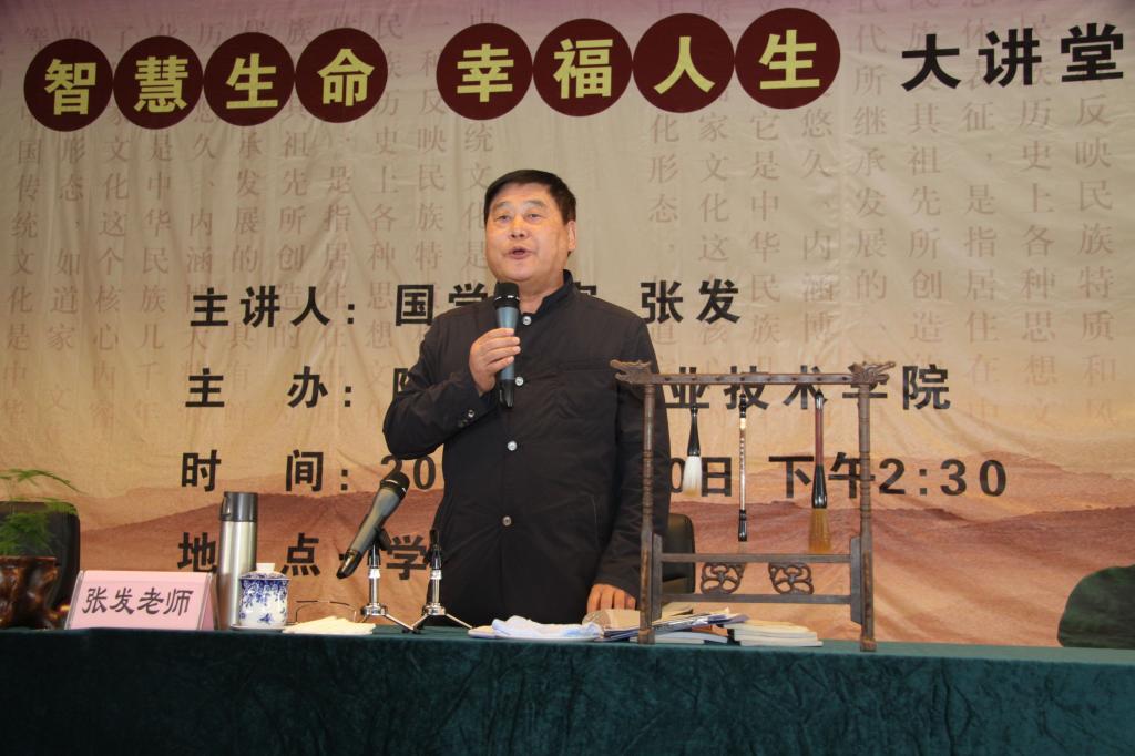 阎平首先宣布我院“中华优秀传统文化公益讲坛——智慧生命,幸福人生”正式启动。他说,为了帮助广大师生了解学习中华民族优秀文化,践行核心价值观,走好人生路,圆好人生梦,我院特邀张发老师作为首场讲师。张发老师在工作中大力推行《弟子规》,诸子名家格言等经典。在他的倡导下,监狱教育工作者用仁、爱、廉、诚信教育服刑人员并取得良好效果,被《人民日报》、《海南日报》等各大媒体争相报道,得到司法部等单位的高度肯定。此后张发老师立志弘扬中国传统文化,让更多的人在迷茫中看到希望,在顺境中提升智慧。近几年,张发老师到全国各地宣讲,听众达50余万人,使广大干部和教师深受启发。