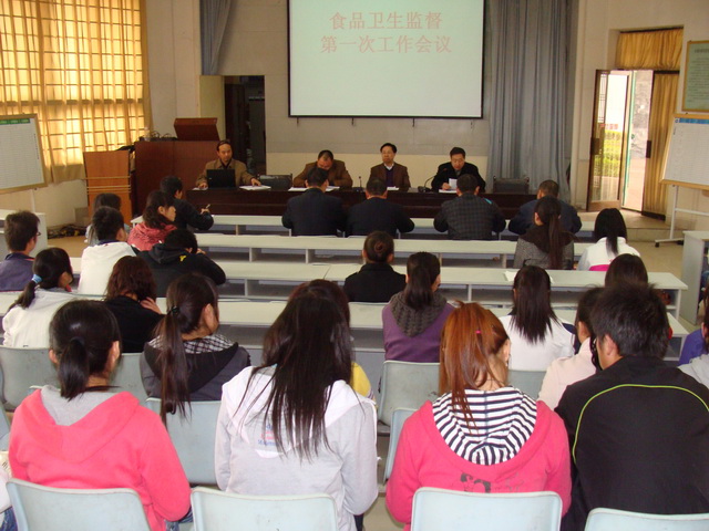 2010年3月25日下午16:00时,陕财职院食品卫生监督第一次工作会议在学院电教室召开。主管副院长王文汉、后勤服务中心副主任王爱军、耿艺航出席了会议。会议由卫生所负责人李积敏主持。餐饮公司各食堂经理、学院各系各班级学生食品卫生义务监督检查员80多人参加了会议。